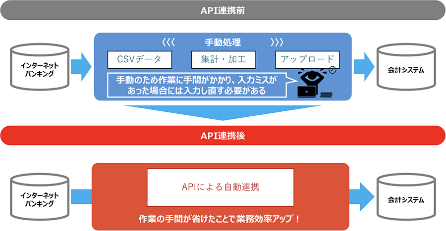 API連携を導入することで、インターネットバンキングと会計ソフトが直接パイプでつながり、人の手を介さず、銀行の入出金データが自動的に会計ソフトへ反映されるようになります。